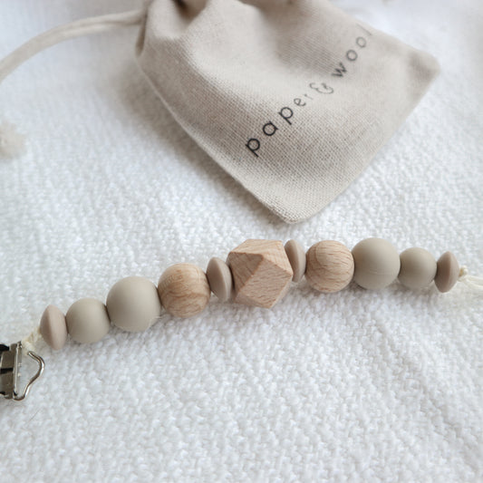 Silicone and wood bead dummy/teether clip
