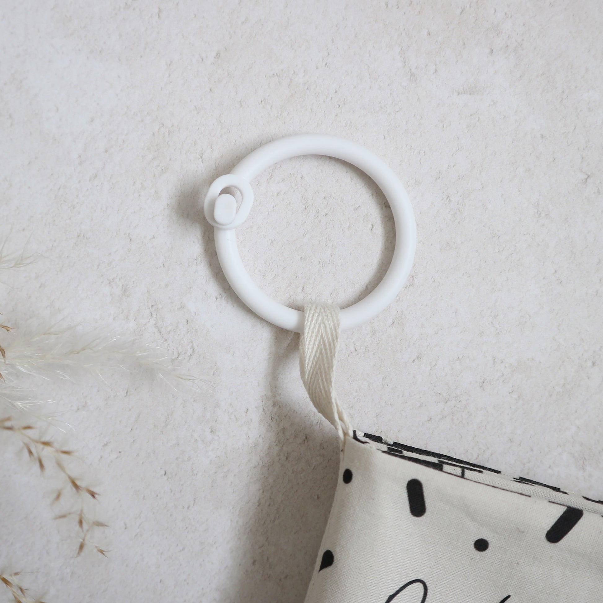 A simple ring to attach to soft books or other play toys, perfect for then attached to a pram or play frame.
