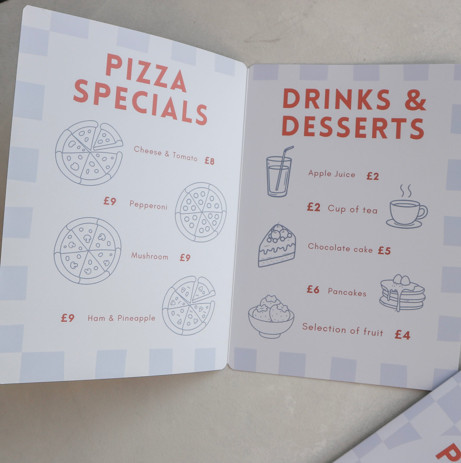 Turn your child’s pretend pizza restaurant into a real slice of fun with their very own personalised play menu! Featuring their name (e.g., Freshly prepared by Amelia), this adorable menu is packed with delicious pretend pizza toppings, drinks and desserts —perfect for imaginative role play.