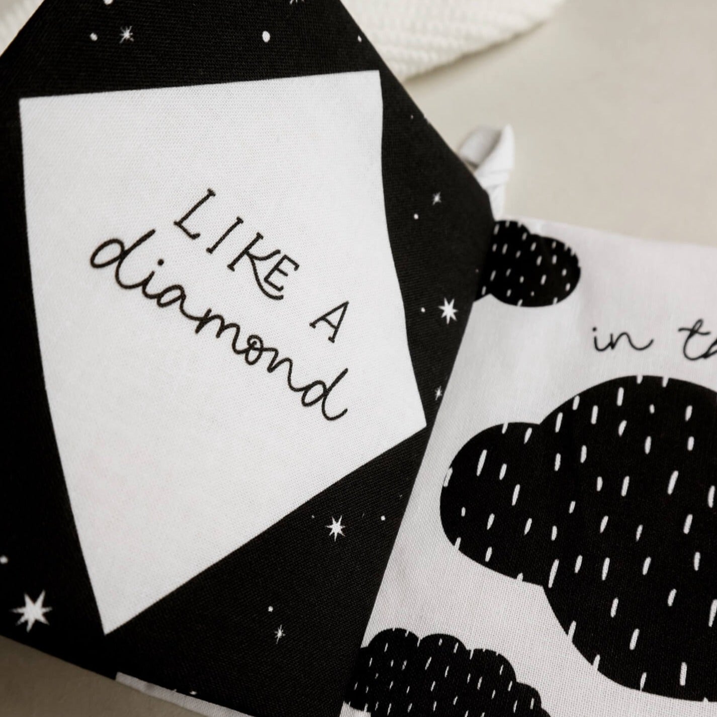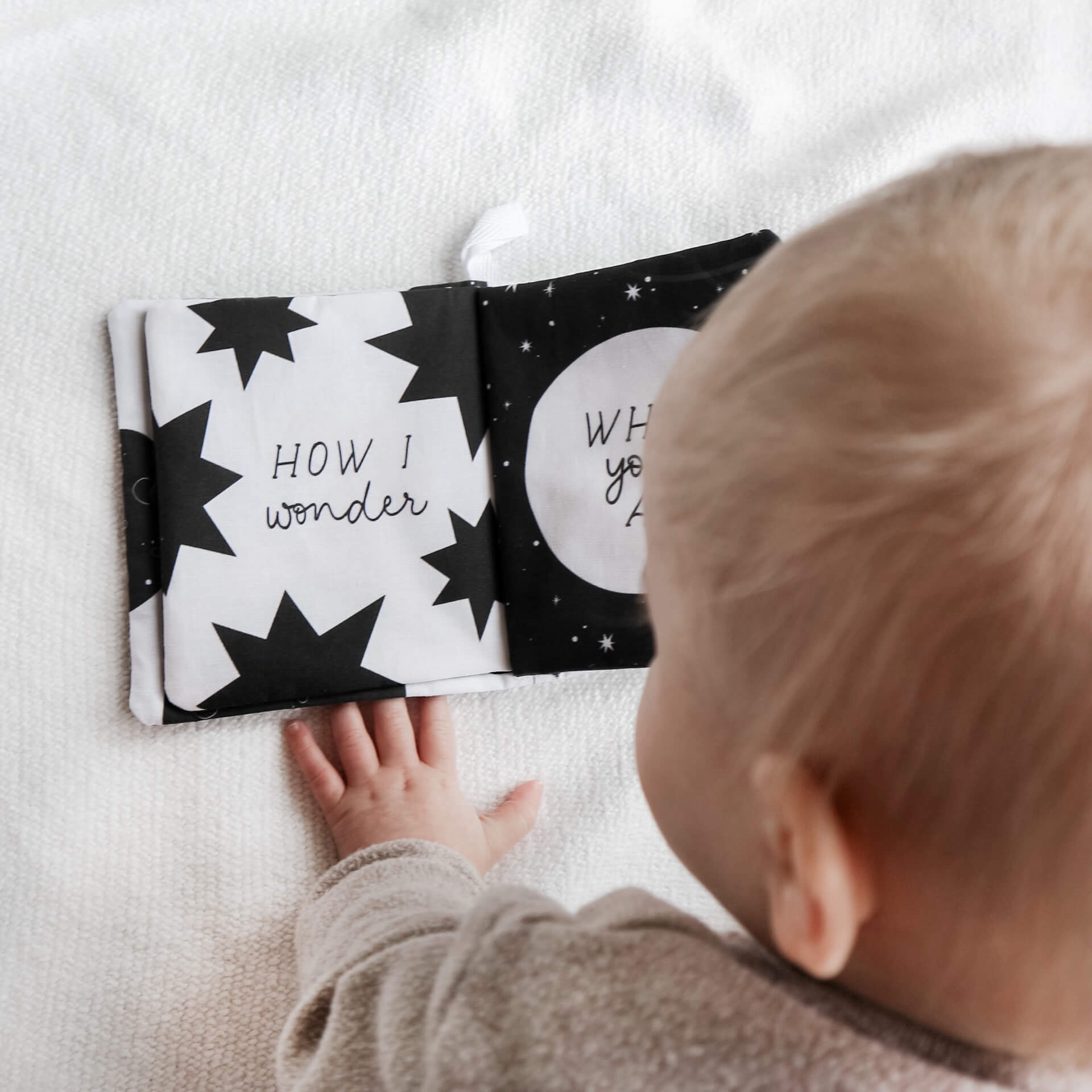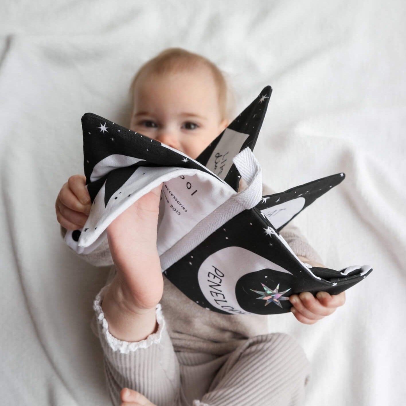 Our fun star themed soft book is perfect for little hands and eyes. Suitable from birth to toddlers, the high contrasts of light and dark shapes on every page are engaging for your tiny baby's development. With crinkly pages, and shiny stars that babies love, this book will be a toy you reach for again and again.