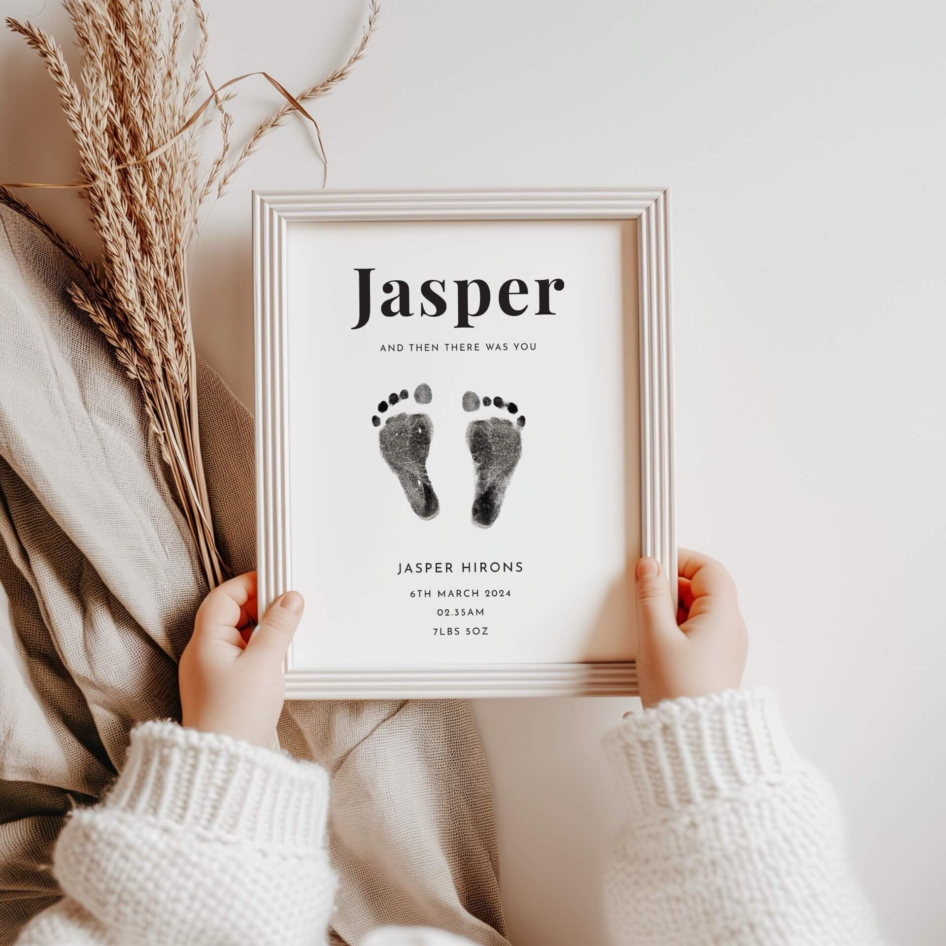 This Personalised new baby print will be a treasured keepsake that celebrates the arrival of your precious little one. This unique print allows you to capture those tiny newborn toes by adding their hand or footprint directly onto the artwork, creating a heartfelt keepsake that will be cherished for years to come.